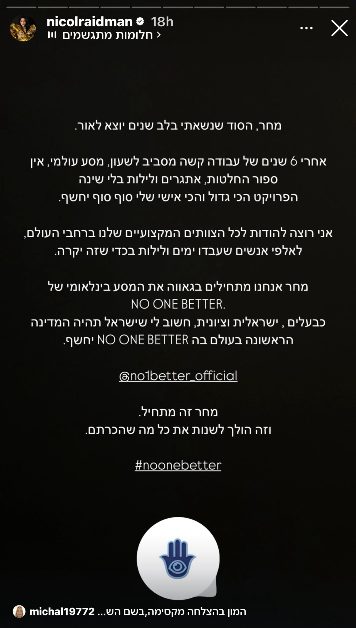 אשת העסקים ניקול ראידמן, חשפה אמש (שבת) את תחושותיה בסטורי בעמוד האינסטגרם שלה לקראת המותג החדש, שעונה לשם "NO1BETTER", היא שיתפה: "מחר, הסוד שנשאתי בלב שנים יוצא לאור. אחרי 6 שנים של עבודה קשה מסביב לשעון, מסע עולמי, אין ספור החלטות, אתגרים ולילות בלי שינה, הפרויקט הכי גדול והכי אישי שלי, סוף סוף ייחשף".