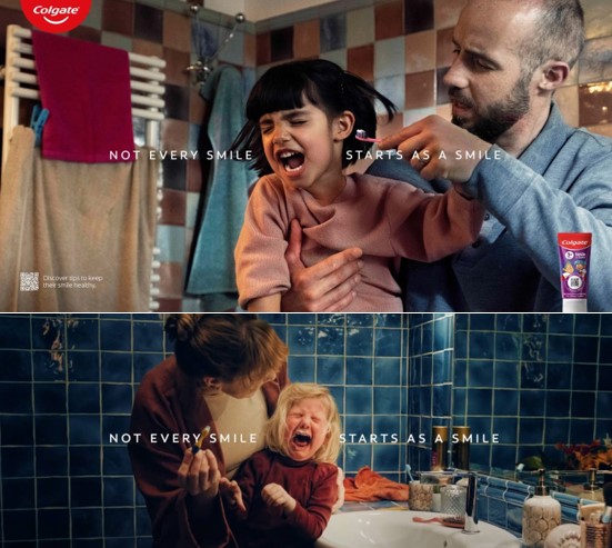 עוד מיתוס שמתנפץ לו הוא שפרסום חייב להיות פוזיטיבי, והנה קולגייט עושה זאת שוב גם השנה עם אריה כסף בסדרת מודעות בקטגוריית פרינט עבור “Not Every Smile Starts As A Smile” לא כל חיוך מתחיל בחיוך. אם תסירו לרגע את הכותרת המתנוססת במודעה, ניתן לחשוב בטעות, שמדובר בקמפיין נגד התעללות הורים בילדים, אלא שהכותרת מסבירה את הכל. לא כל חיוך מתחיל בחיוך.