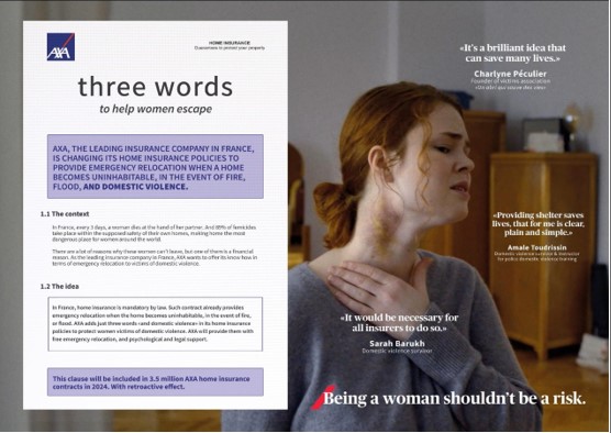 AXA מחליפה את שלוש המילים הקלאסיות המופיעות בכל פוליסת ביטוח דירה "אש, הצפה וגניבה" ב- "אש, הצפה ואלימות במשפחה (And domestic violence)". לא מדובר רק בשינוי סמנטי וסמלי, אלא AXA מרחיבה את הכיסוי הביטוחי בפועל, כך שיכלול שירותים של ממש לנפגעות ונפגעי אלימות בתוך ביתם, כגון: כיסוי למימון מקלטים בטוחים, ייעוץ משפטי ורגשי, והכשרת סוכני הביטוח לזיהוי סימני מצוקה כבר במעמד חתימת החוזה.