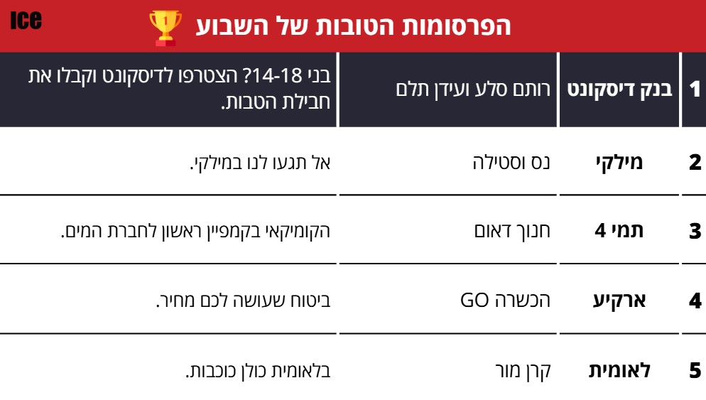 דיסקונט מכריז כי מעתה בני 14 ומעלה יוכלו לפתוח חשבון בנק וליהנות מחבילת הטבות שכוללת מענק הצטרפות, פיקדון גמיש בריבית קבועה של 4% ופטור מעמלות עו"ש עיקריות ומעמלת דמי כרטיס | דירוג הפרסומות הטובות של השבוע