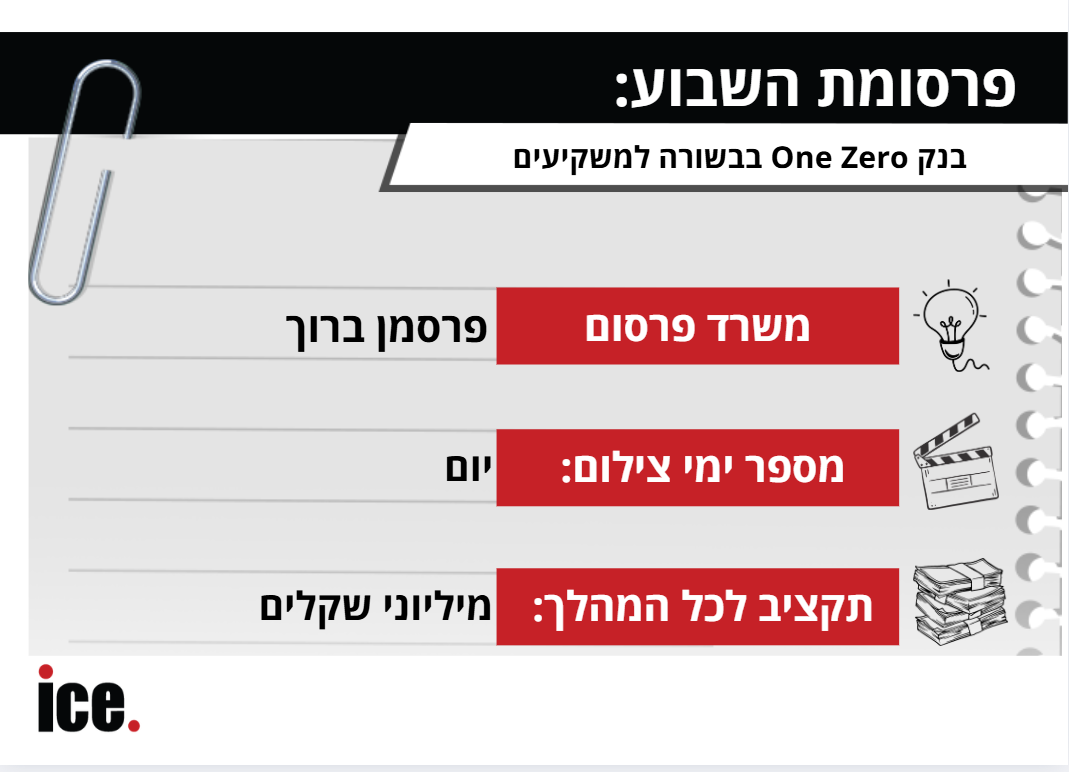 הפרסומת החדשה של בנק One Zero הצליחה לכבוש את תשומת ליבם של הצופים במהלך השבוע ובהם קהל המשקיעים. בקמפיין החדש, שאותו הוביל משרד הפרסום "פרסמן ברוך", הבנק יוצא בבשורה משמחת ומשיק מסלול השקעות ייחודי שפוטר את המצטרפים החדשים מתשלום עמלות מט"ח, עמלות קנייה ומכירה ודמי משמרת.