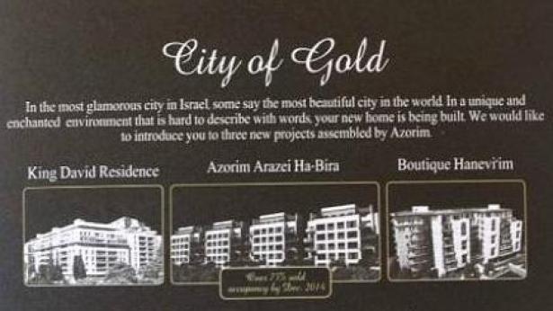 חברת הבנייה \'אזורים\' תחלק זהב בירושלים, בסוף השבוע הקרוב. חברת הנדל\"ן תפתיע את אורחי מלונות היוקרה של ירושלים, עם עלוני מידע שיכילו עלים מזהב אמיתי.