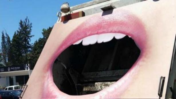 אל הפתח האחורי של הרכב לפינוי אשפה, אליו מרוקנת הפסולת, הוצמדה תמונה של שפתיים פתוחות, מלוות בכיתוב: \"מהיום מקפידים על תזונה נכונה ושמים לב מה מכניסים לפה\".