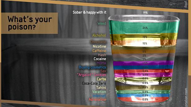 אחת השאלות המעניינות בדקה את העדפות ההתמכרות/רעל/סמים של עובדי המשרד. ניסוח השאלה היה כך: \"What\'s Your Poison?\" כאשר התשובות נעו מצלול ומאושר (מסטול טבעי, כאילו?) עם 19%, אלכוהול 18%, שוקולד 15%, ניקוטין 9%, קפאין 5%, חשיש וקוקאין 2%, MDMA 1.5% סקס וקולה זירו עם 0.5%, וגולת הכותרת, התשובה שגרפה את מירב הקולות, מעל כולם העשב השמח, הירוק הריחני - גראס - עם 24%.