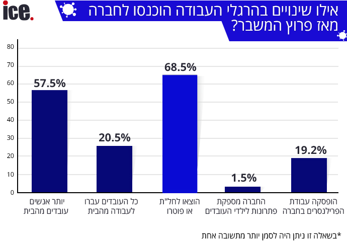 בנוגע לשינויים במקום העבודה, בה ניתן היה לבחור יותר מתשובה אחת, עלו ההשלכות הקשות של המשבר: בכ-69% מהחברות עובדים הוצאו לחל"ת או פוטרו, ב-57% מהחברות בוצע מעבר מלא או חלקי לעבודה מהבית, והפגיעה בעצמאים גם היא ניכרת - בכ-20% ממקומות העבודה הופסקה עבודת הפרילנסרים.