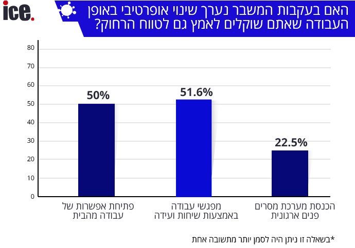 מרבית המפרסמים ציינו כי במקום עבודתם נערכו שינויים אופרטיביים באופן העבודה, וכי ייתכן שיאומצו גם לטווח הרחוק. מדובר על שינויים כגון: פתיחת אפשרות של עבודה מהבית, מפגשי עבודה באמצעות שיחות ועידה והטמעת מערכת מסרים פנים ארגונית.