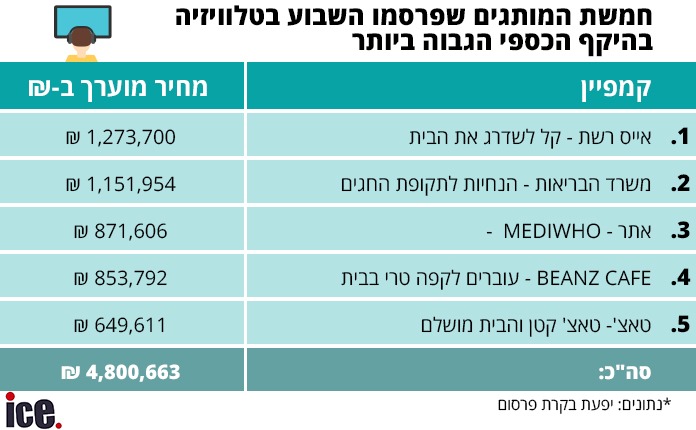 במקום הראשון רשת ACE עם קמפיין "קל לשדרג את הבית", בהשקעה של כ-1.27 מיליון שקל. במקום השני נמצא משרד הבריאות שפרסם את ההנחיות לתקופת החגים בכ-1.15 מיליון שקל, לעומת השקעה של כ-1.56 מיליון בשבוע שעבר בפרסום בטלוויזיה – ירידה של כ-26.2%. אתר MEDIWHO שמספק מידע בתחום הבריאות במקום השלישי עם קמפיין בשווי של כ-871 אלף שקל. מיד אחר כך BEANZ CAFÉ שמשווקים משלוחי קפה עד הבית, בהשקעה של כ-853 אלף שקל. סוגר את החמישייה הראשונה קמפיין טאצ' למוצרי ניקוי הבית בהובלת אילנית לוי, עם תקציב פרסום של כ-649 אלף שקל בטלוויזיה השבוע.