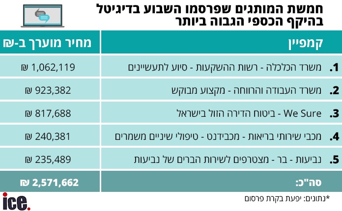 בדומה להיקף הפרסום בטלוויזיה, גם היקף הפרסום בדיגיטל רשם ירידה – של כ-21.6%, עם השקעה של 2.57 מיליון שקל השבוע לעומת 3.28 מיליון בשבוע שעבר. 5 המותגים שהשקיעו השבוע הכי הרבה כסף בפרסום בדיגיטל הם (בסדר יורד): משרד הכלכלה, משרד העבודה והרווחה, We Sure, קופת החולים מכבי ונביעות.