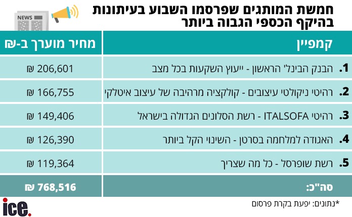 במקום הראשון הבנק הבינלאומי שהשקיע כ-206 אלף שקל בקמפיין "ייעוץ השקעות בכל מצב". אחריו בפער ניכר רהיטי ניקולטי עם השקעה של כ-166 אלף שקל, לאחר שבועיים במקום הראשון. במקום השלישי נמצאת חברת רהיטים גם כן – רהיטי ITALSOFA בקמפיין "רשת הסלונים הגדולה בישראל" בהשקעה של כ-149 אלף שקל. אחריהם האגודה למלחמה בסרטן שהשקיעה כ-126 אלף שקל בקמפיין "לפעמים גם לתחושה או לשינוי הקל ביותר יש משמעות". רשת שופרסל סוגרת את החמישייה עם פרסום בעיתונות בשווי של כ-19 אלף שקל.