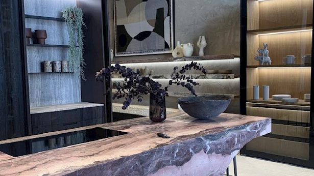 למשל, בחזית האולם מוצב דגם של מטבח העשוי מסלע שנחצב במיוחד עבור חברת סמל. הייחוד הוא באי המפוסל בצורה גיאומטרית א-סימטרית בגווני אבן בלתי שגרתיים וזאת לצד ארון מעץ מיושן בטכנולוגיה מתקדמת וויטרינה מרחפת.
