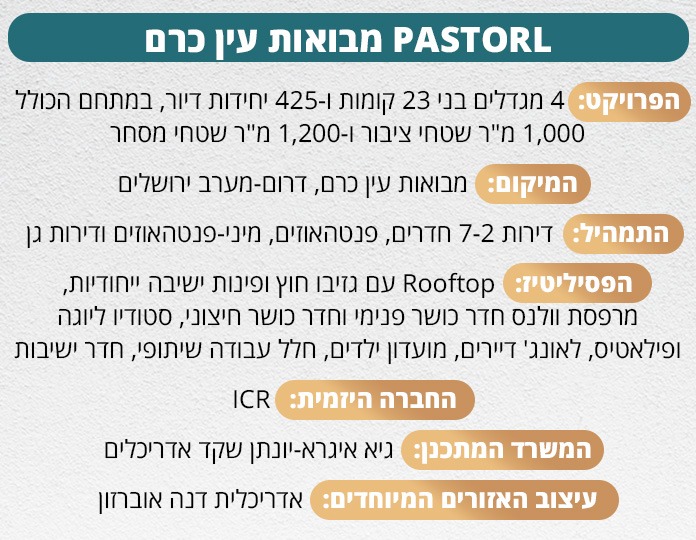 "במורדות עין כרם מוקם מתחם מגורים יוקרתי ומודרני", מתאר אדריכל יוני שקד, ממשרד גיא איגרא-יונתן שקד אדריכלים, האמון על תכנון פרויקט PASTORAL. "מיקום הפרויקט על צלע ההר, מדבר בעד עצמו. כדי לגשר על פערי הטופוגרפיה בין הרחובות ברזיל והנטקה בהם נמצא המתחם – נדרשנו לייצר בנייה מדורגת, שתאפשר לדיירים בכל אחד מהמגדלים ליהנות מאיכויות הנוף. מעבר לזה, מתאפיין המתחם בהשקעה גדולה בשטחים המשותפים ובמרחב הציבורי, כולל רחבות תצפית גדולות בין הבניינים. הפרויקט מבטא ומיישם את הטוב של ירושלים, ומתכתב עם תהליכי ההתחדשות שעובר האזור".