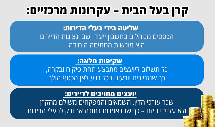 כאן המקום להסביר: בתחום ההתחדשות העירונית מקובל כיום כי את שכרם של נבחרת היועצים שתפקידה להגן על הדיירים בפרויקט, מממן דווקא היזם – מצב שבפועל מייצר תלות מובנית ומעלה חשש לניגוד עניינים. קרן "בעל הבית" תכליתה לשבור את התלות הזו: להפריד באופן מלא בין היזם ליועצים, ולבסס נאמנות מלאה מצידם כלפי בעלי הדירות בלבד.