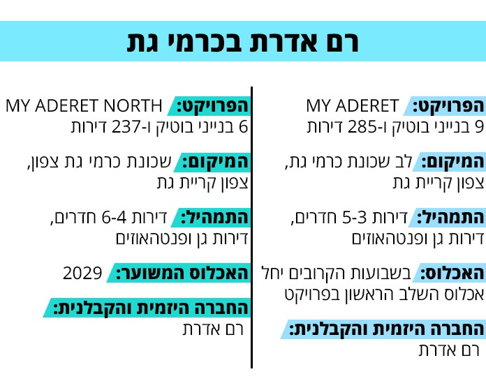 "ידענו לזהות את הפוטנציאל של כרמי גת כבר לפני מספר שנים", מתאר דורון נמרוד, מנכ"ל משותף בקבוצת רם אדרת. "בשנת 2021 רכשנו את המגרש הראשון בשכונה, כשלאור הביקושים ועליית ערך הדירות בפרויקט MY ADERET, זכינו במכרז נוסף בכרמי גת צפון עליו ייבנה הפרויקט החדש – במה שמהווה למעשה עדות נוספת לאמונה הגדולה שלנו בעיר ובאזור".