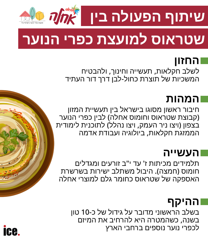 אחרי שלושה עשורים בהם הפך חומוס אחלה לפריט חובה במטבח הישראלי, בחרו השנה בשטראוס לעשות עוד צעד קדימה: השקת שיתוף פעולה ראשון מסוגו עם מועצת כפרי הנוער כשהיעד חד וברור: לחבר בין חקלאות, תעשייה וחינוך – ולהבטיח המשכיות של תוצרת כחול-לבן באמצעות דור העתיד. התוכנית ממזגת בין חקלאות, ביולוגיה ועבודת אדמה, ובמסגרתה לוקחים התלמידים חלק בכל שלבי גידול החומוס: מהזריעה, דרך תצפיות וניסויים ועד הקציר.