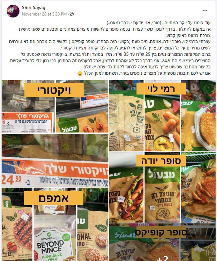 לפוסט שעלה לאוויר ביום שני האחרון (28.11) ואליו מצורפים תצלומים של מחירי פריטי מזון צמחוניים וטבעוניים משלל רשתות שיווק ברחבי תל אביב, אחראית שירי סייג – והוא משקף את התחושות של רבים מתושבי העיר, שמאסו בתמחור הגבוה של מוצרים טבעוניים. קצת מוזר, אבל דווקא נובמבר מצוין ברחבי העולם כחודש הטבעונות הבינלאומי, מתוך יעד ברור לעודד את הציבור לצרוך מוצרים שאינם מן החי – אלא שבפועל, גם מי שמשתכנעים להתנסות נרתעים לא פעם מהמחיר.