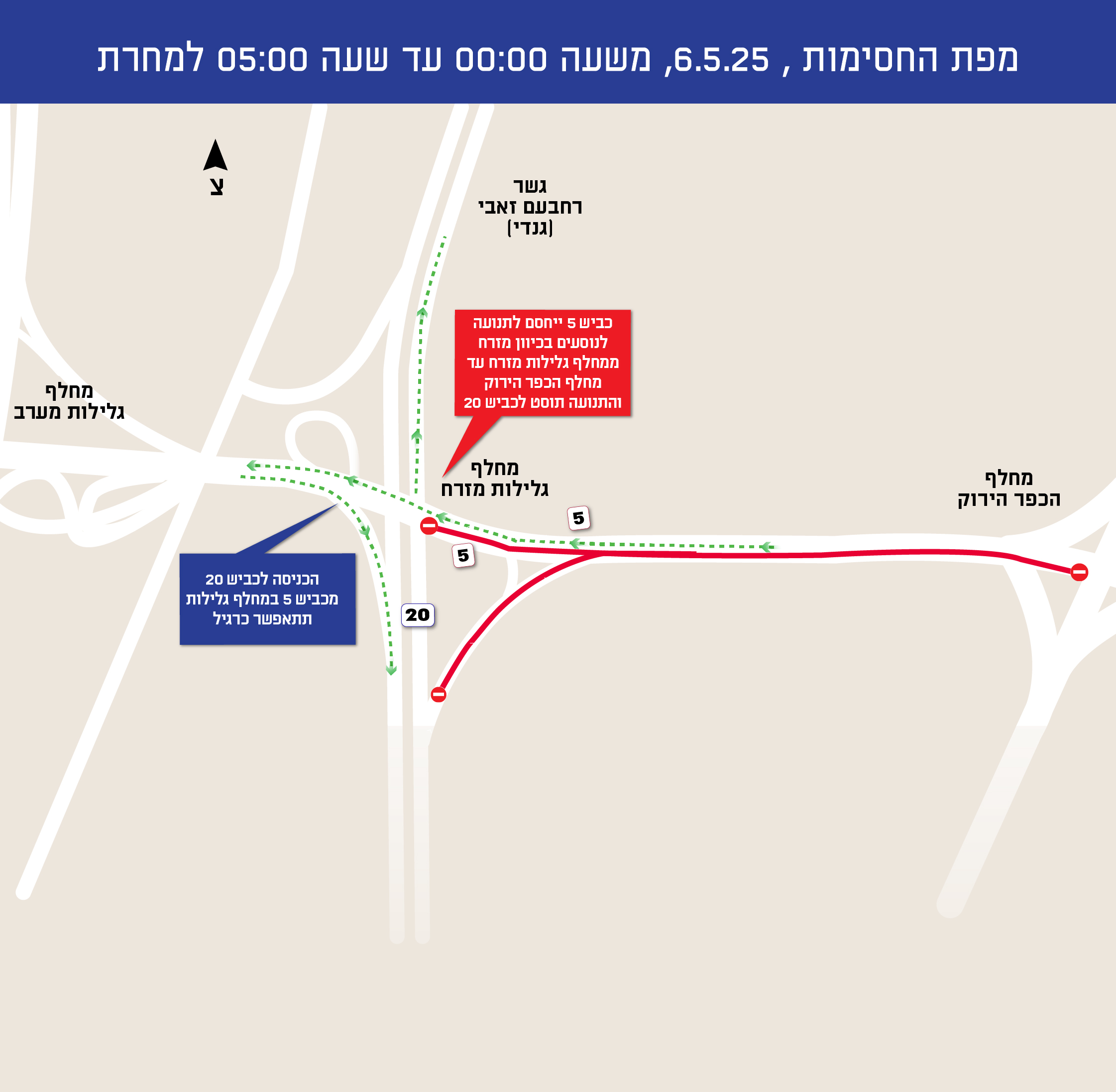בלילה שבין שלישי לרביעי, 06.05.25, משעה 00:00 עד שעה 05:00, ייחסם כביש 5 לנוסעים בכיוון מזרח, בין מחלף גלילות מזרח למחלף הכפר הירוק, עקב עבודות להתקנת גשר שילוט במסגרת פרויקט 'נתיבים מהירים'.