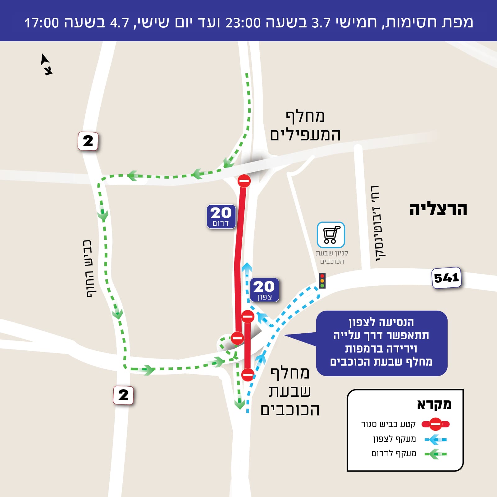 במהלך העבודות, ייחסם הרמטית לתנועה כביש 20 (נתיבי איילון) לכיוון דרום ממחלף המעפילים ועד מחלף שבעת הכוכבים. לנוסעים לכיוון צפון, רמפת הירידה מכביש 20 למחלף שבעת הכוכבים ורמפת העלייה בחזרה לכביש 20 תהיינה פתוחות ותאפשרנה מעקף לחסימת הכביש והמשך נסיעה צפונה.