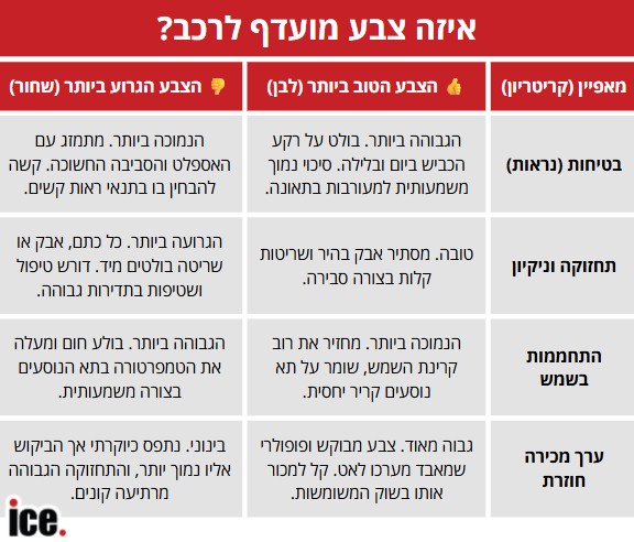 בנוסף, במדינה שטופת שמש כמו שלנו, לרכב לבן יש יתרון תרמי משמעותי, כשהוא יכול להיות קריר יותר בעד 8 מעלות מרכב שחור, מה שחוסך עבודה למזגן ואנרגיה. לבסוף, גם הארנק שלכם יודה לכם, שכן דוחות שוק מראים באופן עקבי שלבן הוא בין הצבעים שמאבדים הכי פחות מערכם והוא נחשב להימור בטוח בשוק המשומשות.