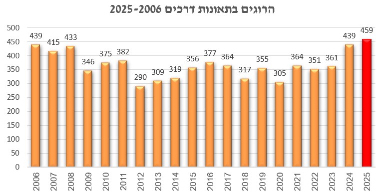 שנת 2025 היא השנה עם מספר ההרוגים הגבוה ביותר בתאונות דרכים מאז שנת 2006. מספר ההרוגים בשנה זו גבוה ב-86 הרוגים מהממוצע השנתי של עשר השנים האחרונות, הנאמד ב- 369 הרוגים, ומשקף עלייה של 23% ביחס לממוצע זה.