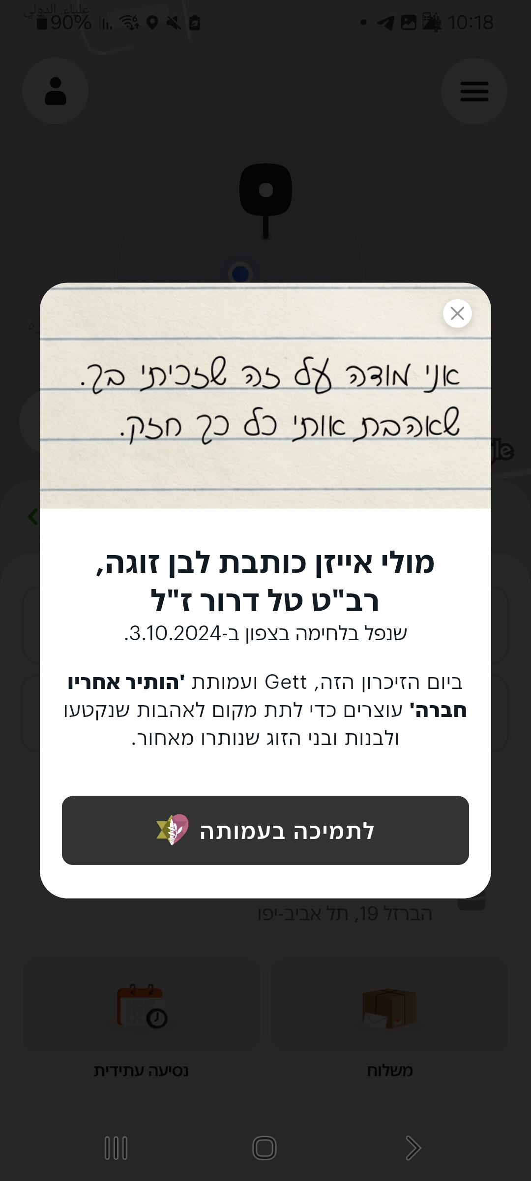 בעקבות כך נולד שיתוף הפעולה עם Gett, שמעניק חשיפה רחבה לסיפורים האישיים באמצעות האפליקציה. החל מערב יום הזיכרון ולמשך 24 שעות, במהלך הזמנת נסיעה, תופיע הודעה אישית הכוללת מילים שנכתבו על ידי בני ובנות הזוג, לצד תיאור נסיבות הנפילה וקישור לתמיכה בפעילות. באופן זה, הסיפורים אינם נותרים במרחב הפרטי בלבד, אלא מקבלים נוכחות רחבה יותר כחלק מהשיח הציבורי.