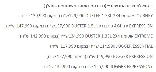 בימים שיוקר המחייה עולה וכמעט כל השוק מעלה מחירים, דאצ׳יה באמצעות פריסבי היבואנית, פעלו מאחורי הקלעים על מנת לשפר עוד יותר את העסקאות המוצעות ללקוח הישראלי ומשיקים את המחירים החדשים לרוב דגמי דאסטר הדור החדש וג׳וגר החדש.