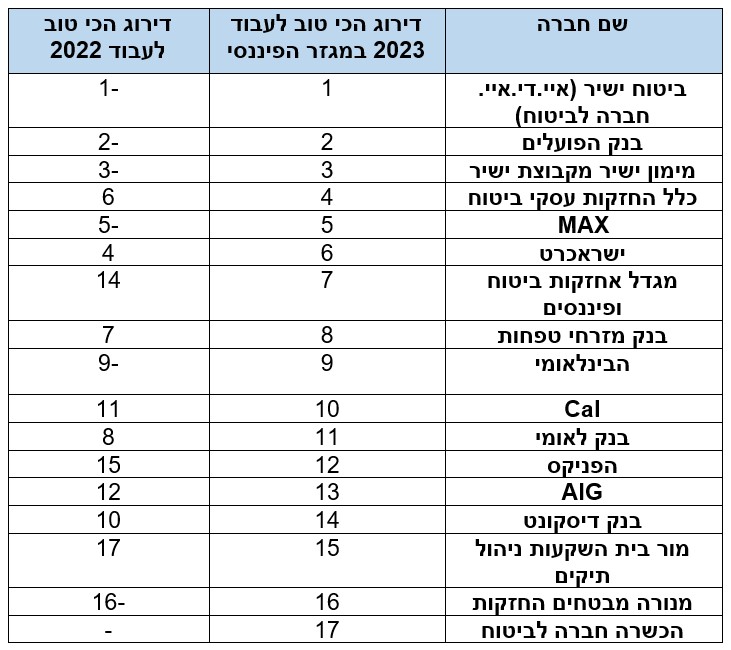 ביטוח ישיר היא החברה מהמגזר הפיננסי שהכי טוב לעבוד בה, כך עולה מהדירוג השנתי של CofaceBdi לשנת 2023, המציג את רשימת 100 החברות שהכי טוב לעבוד בהן זו השנה ה-19 ברציפות. למקום השני בדירוג החברות הפיננסיות הגיע בנק הפועלים, ולמקום השלישי הגיעה חברת מימון ישיר. כמו כן, חברת מור בית השקעות הוא בית ההשקעות היחיד שנכנס לדירוג, המבוסס על סקר שנערך בקרב כ-300,000 מועסקים בלמעלה מ-150 חברות בענפי המשק הישראלי, בהן המגזר הפיננסי. מגדל אחזקות ביטוח ופיננסים היא החברה הפיננסית שרשמה את הזינוק הגדול ביותר בדירוג והגיעה השנה למקום ה-7 בדירוג הפיננסי. בדירוג אשתקד התברגה במקום ה-14 בלבד.