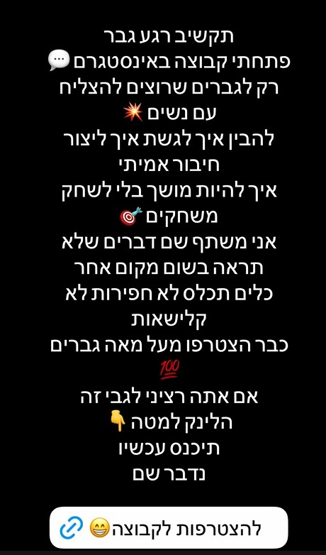 בהמשך נכתב: "אני משתף שם דברים שלא תראה בשום מקום אחר, כלים תכלס, לא חפירות, לא קלישאות. כבר הצטרפו מעל מאה גברים. אם אתה רציני, תיכנס עכשיו ונמשיך לדבר".