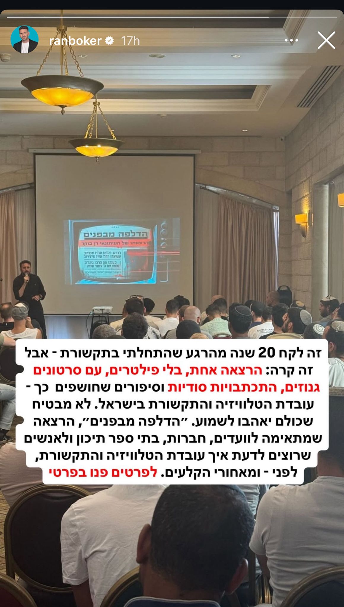 "זה לקח 20 מהרגע שהתחלתי בתקשורת - אבל זה קרה", אמר בוקר בראשית דבריו, והמשיך: "הרצאה אחת, בלי פילטרים, עם סרטונים גנוזים, התכתבויות סודיות וסיפורים שחופשים - כך עובדת הטלוויזיה והתקשורת בישראל".