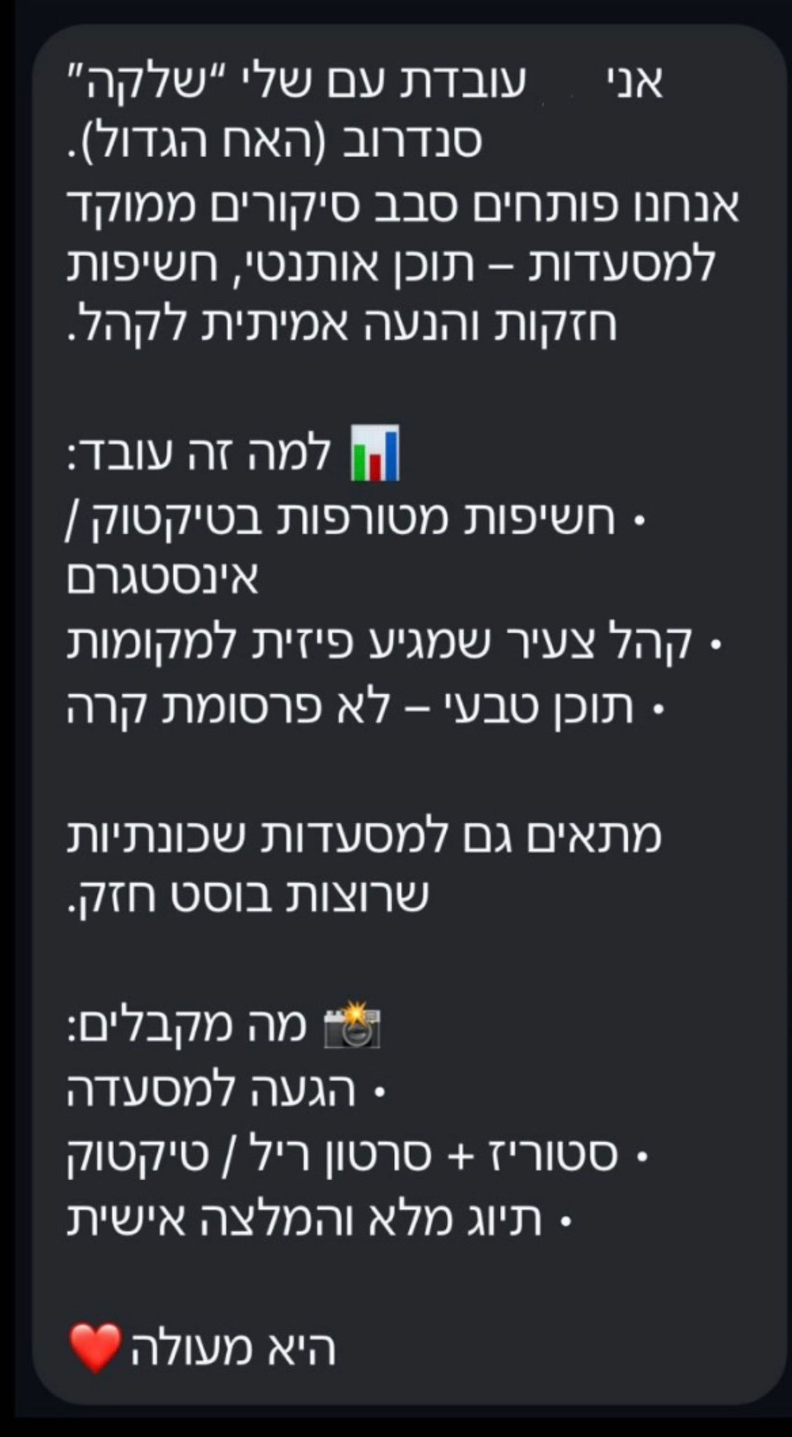 כך נכתב: "אני עובדת עם שלקה, אנחנו פותחים סבב סיקורים ממוקד למסעדות – תוכן אותנטי, חשיפות חזקות והנעה אמיתית לקהל. למה זה עובד: חשיפות מטורפות בטיקטוק / אינסטגרם, קהל צעיר שמגיע פיזית למקומות, תוכן טבעי - לא פרסומת קרה. מתאים גם למסעדות שכונתיות שרוצות בוסט חזק. מה מקבלים: הגעה למסעדה, סטוריז + סרטון ריל / טיקטוק, תיוג מלא והמלצה אישית, היא מעולה"; צפו.