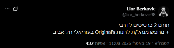 כמו כל הרבה בעלי עסק, גם ליאור בימים מחפש עובדים לחנות שלו בקניון עזריאלי ונתקל בקשיים רבים. "למה אף אחד במדינה שלנו לא רוצה לעבוד?", כתב בחשבון ה-X שלו והוסיף: "כולם מיליונרים ואני לא יודע?!". בציוץ נוסף כתב ספק בהומור: "תורם 2 כרטיסים לדרבי + מחפש מנהל/ת לחנות Original’s בעזריאלי תל אביב".