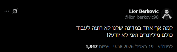 בנו של אייל ברקוביץ': "למה אף אחד במדינה שלנו לא רוצה לעבוד?"