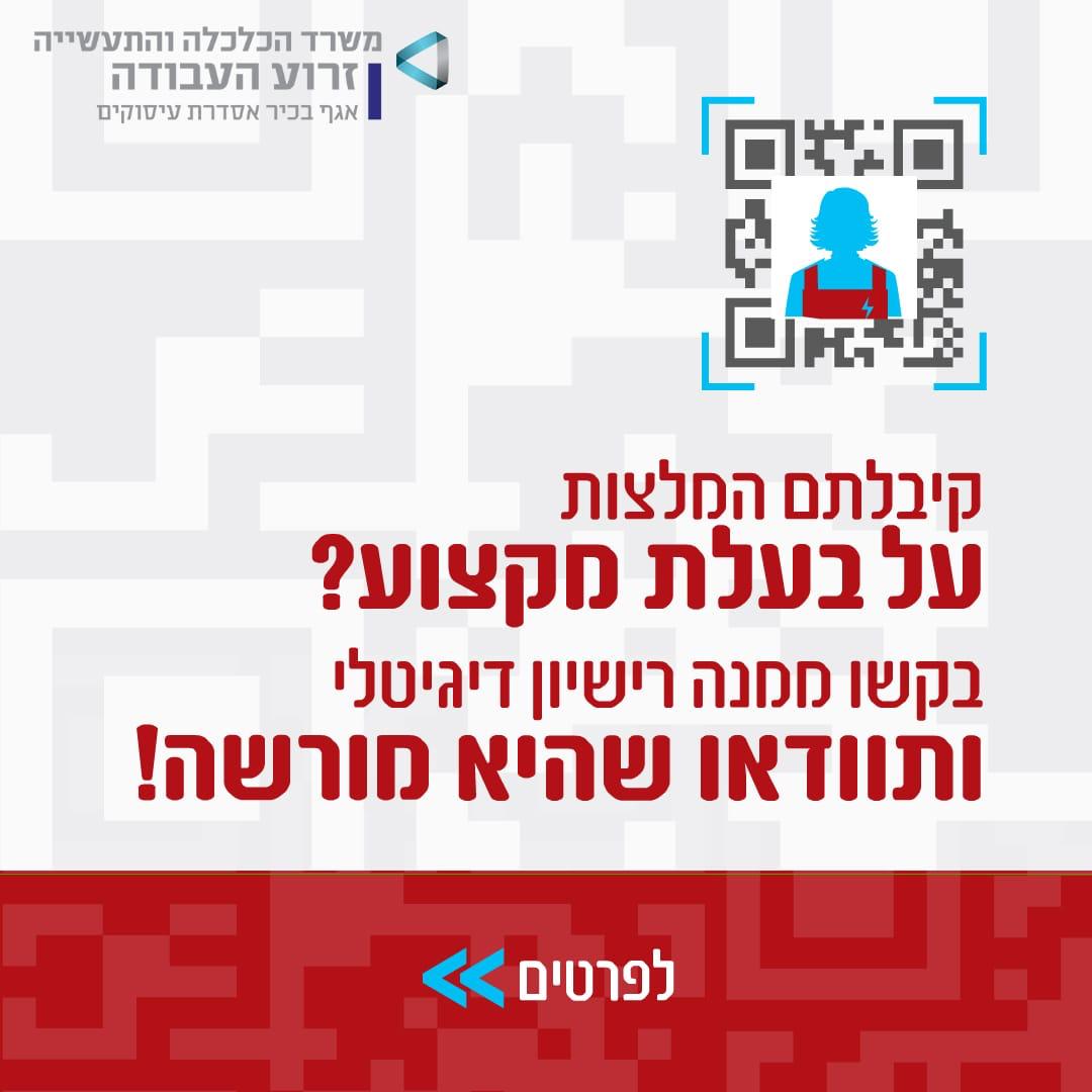 מהפכה בשירות: מעבר לרשיונות דיגיטליים ולתעודות רישום בפנקסים מקצועיים. ביוזמת אגף בכיר אסדרת עיסוקים בזרוע העבודה, בשיתוף רשות התקשוב הממשלתי במערך הדיגיטל הלאומי במשרד הכלכלה, כלל תעודות הרישום והרישיונות לבעלי מקצוע המאוסדרים בזרוע העבודה הפכו לדיגיטליים
