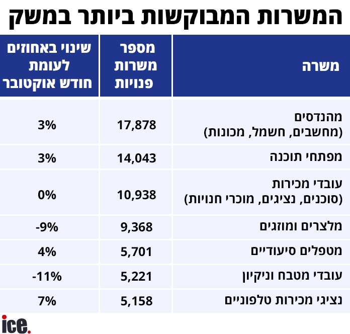 המשרה הכי פנויה בחודשים אלו היא מהנדס, כאשר ישנן לא פחות מ-17,878 משרות הנדסה פנויות, וביניהן מהנדסי חשמל, מחשבים ומכונות. אחריה גם משרה מכובדת בהחלט שנמצאת בעולם דומה: מפתחי תוכנה. בישראל נכון להיום יש 14,043 משרות פנויות למקצוע זה. באחוזים, מספר המשרות הפנויות במקצועות אלו עלה ב-3% לכל אחד מאז אוקטובר האחרון.