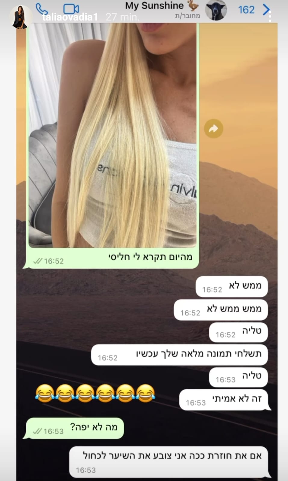 עובדיה חשפה בסטורי שהעלתה את השיער החדש שלה בשיחת ווטסהאפ שערכה עם בן זוגה, שחף רז, כשרשמה לו "מהיום תקרא לי חליסי". שחף רז ממש לא הב את המראה החדש של בת זוגו טליה עובדיה ומיהר לשלוח לה מספר הודעות אחת אחרי השנייה בהן רשם: "ממש לא. ממש ממש לא. טליה, תשלחי לי תמונה מלאה עכשיו. טליה. זה לא אמיתי". טליה הגיבה: "מה לא יפה?". רז הגיב לה: "אם את חוזרת ככה אני צובע לך את השיער בכחול".