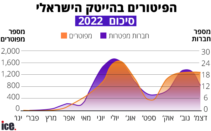כפי שניתן לראות בגרף, בחודשים הראשונים של השנה לא ידוע על חברות הייטק שהצטמצמו, שכן אז עוד האמינו רבים בשוק כי עם היציאה מהקורונה ברחבי העולם העתיד נראה ורוד; האשליה החלה להתנפץ באפריל, כאשר 3 חברות פיטרו כ-120 עובדים; במאי פיטרו 4 חברות יותר מ-400 עובדים; ביוני האמירה המגמה לכמעט 850 מפוטרים מ-21 חברות; ביולי נרשם שיא, כאשר 26 חברות פיטרו יותר מ-1,600 עובדים; באוגוסט אירעה ירידה קלה לכ-1,000 מפוטרים מ-15 חברות; בספטמבר, ככל הנראה בשל ניסיון להימנע מהנזק התדמיתי של שליחת עובדים הביתה בתקופת החגים, פוטרו רק כ-340 עובדים מ-8 חברות; בחודשיים הבאים נרשמה עלייה מחודשת כאשר מספר המפוטרים חזר אל מעל 1,000, ונשאר בטווח של 1,000-1,250 לחודש עד עתה, ומספר החברות המפטרות חזר למספרים דו-ספרתיים.