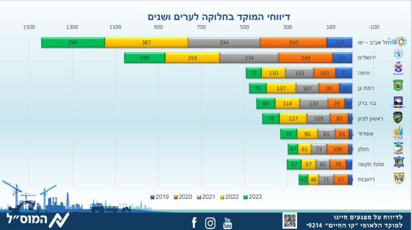 תל אביב שוב בראש רשימת הערים בהם קיימת המודעות הגבוהה ביותר בקרב הציבור להצלת חיים ודיווח על סיכונים בענף הבנייה כשבשנת 2023 התקבלו כ-294 דיווחים בשנת 2023 לעומת 387 שנת 2022 , בירושלים התקבלו כ-190 לעומת כ-253 ב-2022, בבני ברק התקבלו 86 דיווחים לעומת 114 דיווחים בשנת 2022. ברמת-גן התקבלו 79 דיווחים לעומת 137 בשנת 2022. בראשל"צ התקבלו 78 דיווחים גם כן במקום 127 בשנת 2022. בחיפה התקבלו 72 דיווחים במקום 110 בשנת 2022.