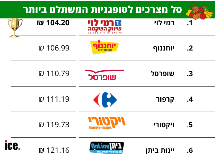 הסל הזול ביותר מצאנו ברשת רמי לוי, עם מחיר של 104.20 שקלים, ואילו הרשת היקרה ביותר הייתה רשת יינות ביתן, עם סל במחיר של 121.16 שקלים – פער של מעל ל-15 שקלים.