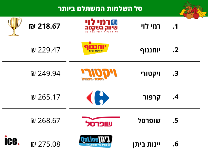 הרשת עם סל ההשלמות הזול ביותר היא רמי לוי, עם סל של 218.67 שקלים עם עלייה של כ-20 שקלים משבוע שעבר, ואילו הרשת היקרה ביותר היא יינות ביתן, עם סל של 275.08 שקלים ללא שינוי משבוע שעבר.