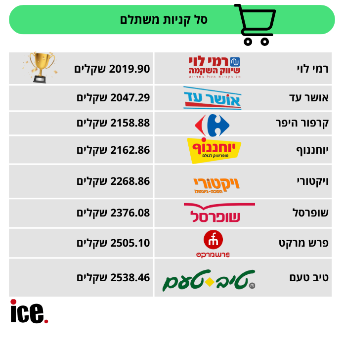הפער בין הרשת הזולה ביותר ליקרה ביותר עומד על 518.56 ₪, המהווים פער של כ-25.67% במחיר סל הקניות. רמי לוי מוביל את טבלת המחירים הנמוכים עם סל בשווי 2,019.90 ₪, כשאחריו ניצבת רשת אושר עד עם סל בעלות של 2,047.29 ₪. בקצה השני של הסקלה נמצאות רשתות טיב טעם ופרש מרקט, עם מחירי סל של 2,538.46 ₪ ו-2,505.10 ₪ בהתאמה.