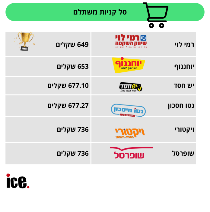 השוואה מקדימה של סלי מזון עשויה לחסוך לצרכן מאות שקלים בחודש. לשם כך, Ice בדק ומצא איזו רשת מזון משתלמת יותר לקנייה גדולה