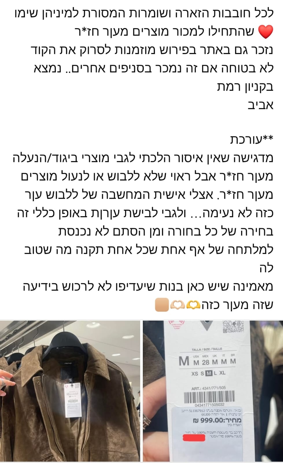 בתמונה שצילמה המשתמשת, נראה ג'קט חום שנמכר לכאורה ברשת ב-999 שקלים ונושא תווית המציינת את הרכב הבד שלו: "מעטפת חיצונית 100% עור חזיר. בטנה 100% פוליאסטר".