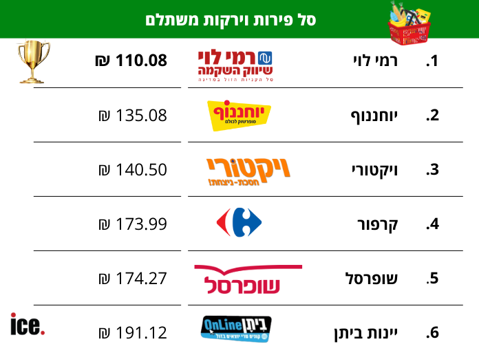כמדי שבוע ice בודק ומוצא, באיזו רשת הכי משתלם לקנות ירקות ופירות. הסל הזול ביותר יצא אצל רמי לוי בעלות של 110.08 שקלים ואילו הסל היקר ביותר יצא אצל יינות ביתן בעלות של 191.12 שקלים. פער של 81 שקלים.