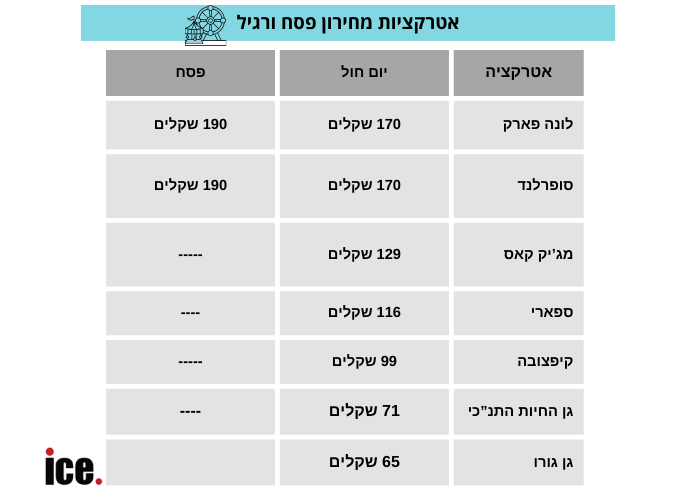 במהלך הבדיקה שערכנו, מצאנו כי רוב האטרקציות לא שינו את מחירי הכניסה בחג, אך נחשף כי ישנן שתי אטרקציות בולטות – סופרלנד ולונה פארק – שמעלות את המחיר בחג הפסח.