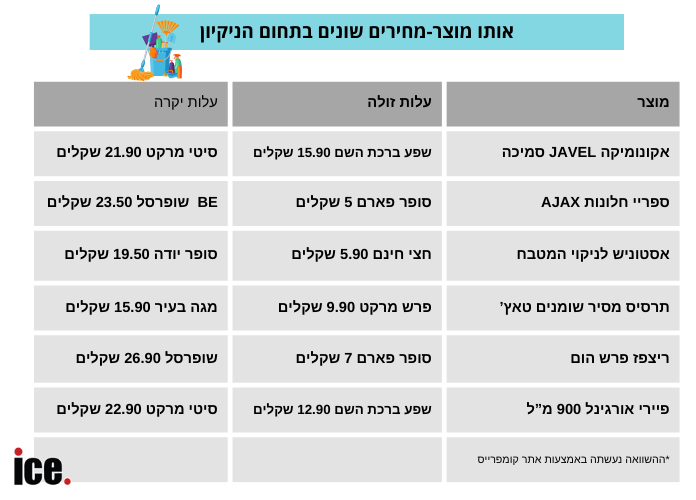 לשם כך, ice בדק ומצא, מהם פערי המחירים של אותם מוצרים ברשתות שונות בחומרי ניקיון. לשם כך, השתמשנו באתר קומפרייס על מנת להשוות את המחירים.