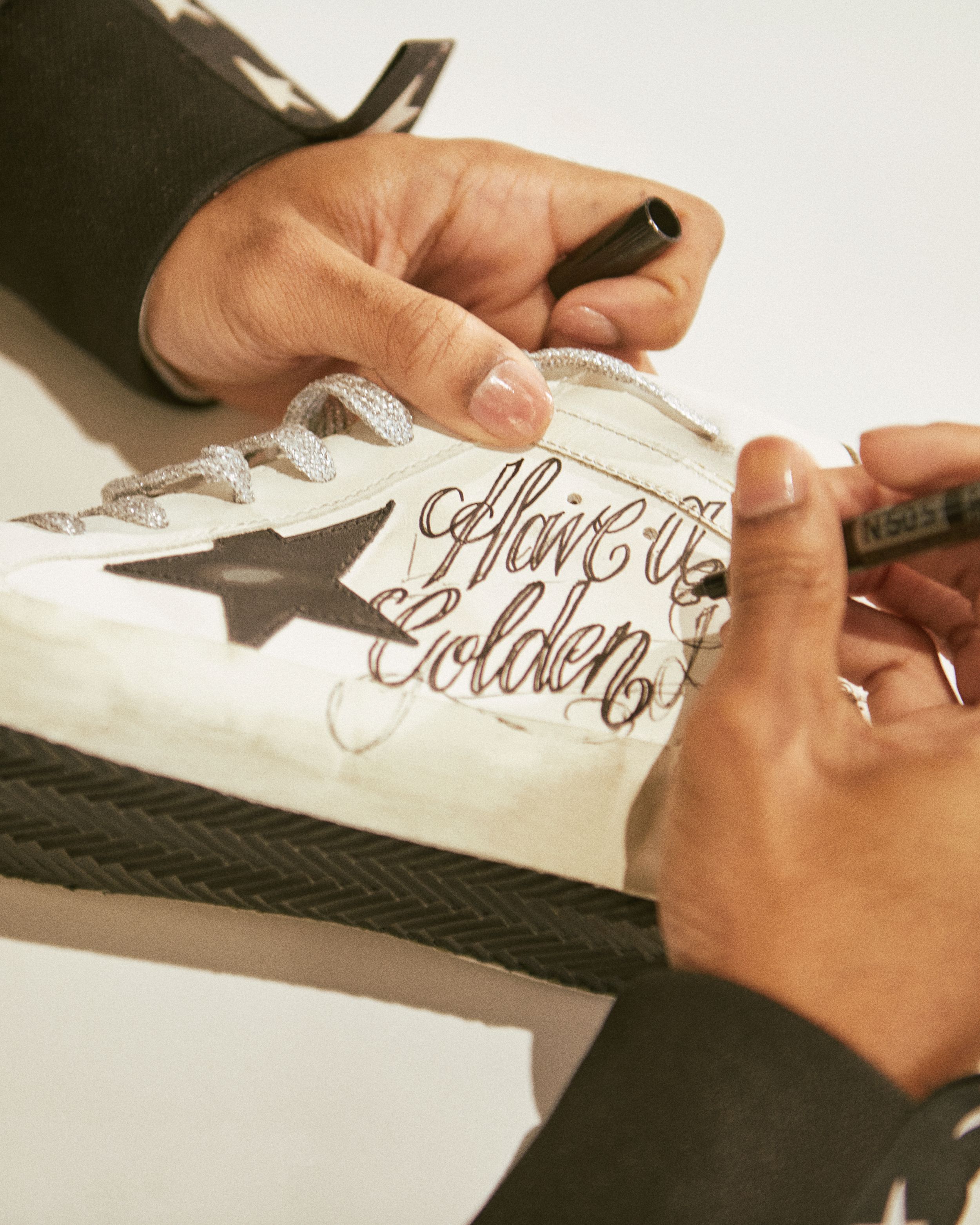 Golden Goose הוא מותג אופנת עילית איטלקי, שנוסד בוונציה בשנת 2000, ומוכר בעיקר בזכות נעלי סניקרס פרמיום בשילוב הכוכב. הנעליים מיוצרות בעבודת יד במראה מחוספס במכוון, המותאמת אישית ללקוח, תוך מתן דגש על תהליך יצירה ייחודי בהתאם להעדפות הלקוח, מה שהפך את המותג בשני העשורים האחרונים לאחד ממותגי העל המובילים והייחודיים בעולם האופנה