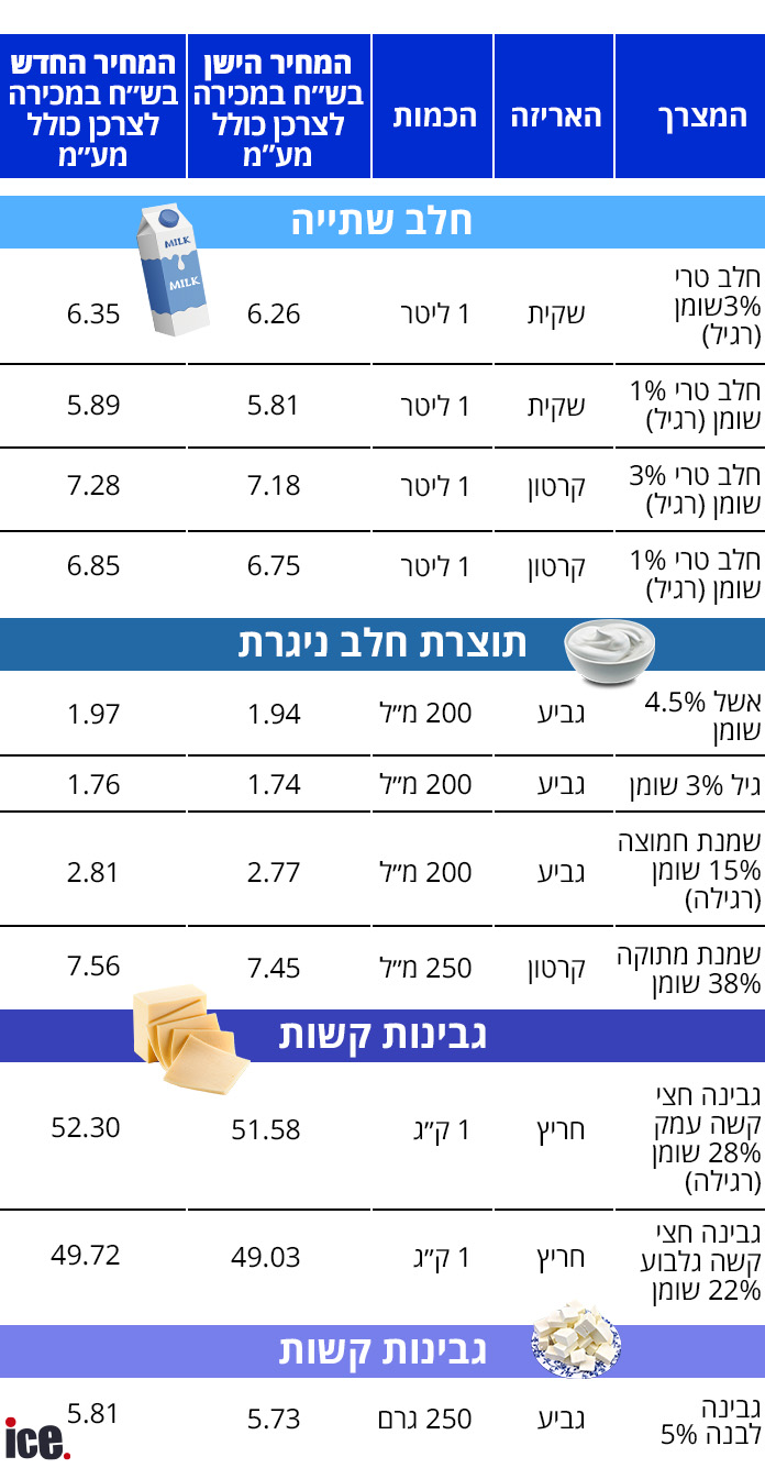 כך עלות מחיר החלב תעלה מעלות של 7.18 שקלים לעלות של 7.28 שקלים, עלייה של כ-10 אג', תלוי רשת מזון. גבינה לבנה תעלה מעלות של 5.73 שקלים לעלות של 5.83 שקלים, גבינה צהובה 28% לק"ג תעלה מעלות של 51.58 שקלים לעלות של 52.30 שקלים.