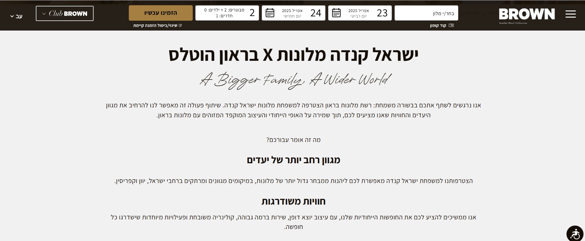 "אנו נרגשים לשתף אתכם בבשורה משמחת – רשת מלונות בראון הצטרפה למשפחת מלונות ישראל קנדה. שיתוף פעולה זה מאפשר לנו להרחיב את מגוון היעדים והחוויות שאנו מציעים לכם, תוך שמירה על האופי הייחודי והעיצוב המוקפד המזוהים עם מלונות בראון. מה זה אומר עבורכם? מגוון רחב יותר של יעדים – הצטרפותנו למשפחת ישראל קנדה מאפשרת לכם ליהנות ממבחר גדול יותר של מלונות, במיקומים מגוונים ומרתקים ברחבי ישראל, יוון וקפריסין".