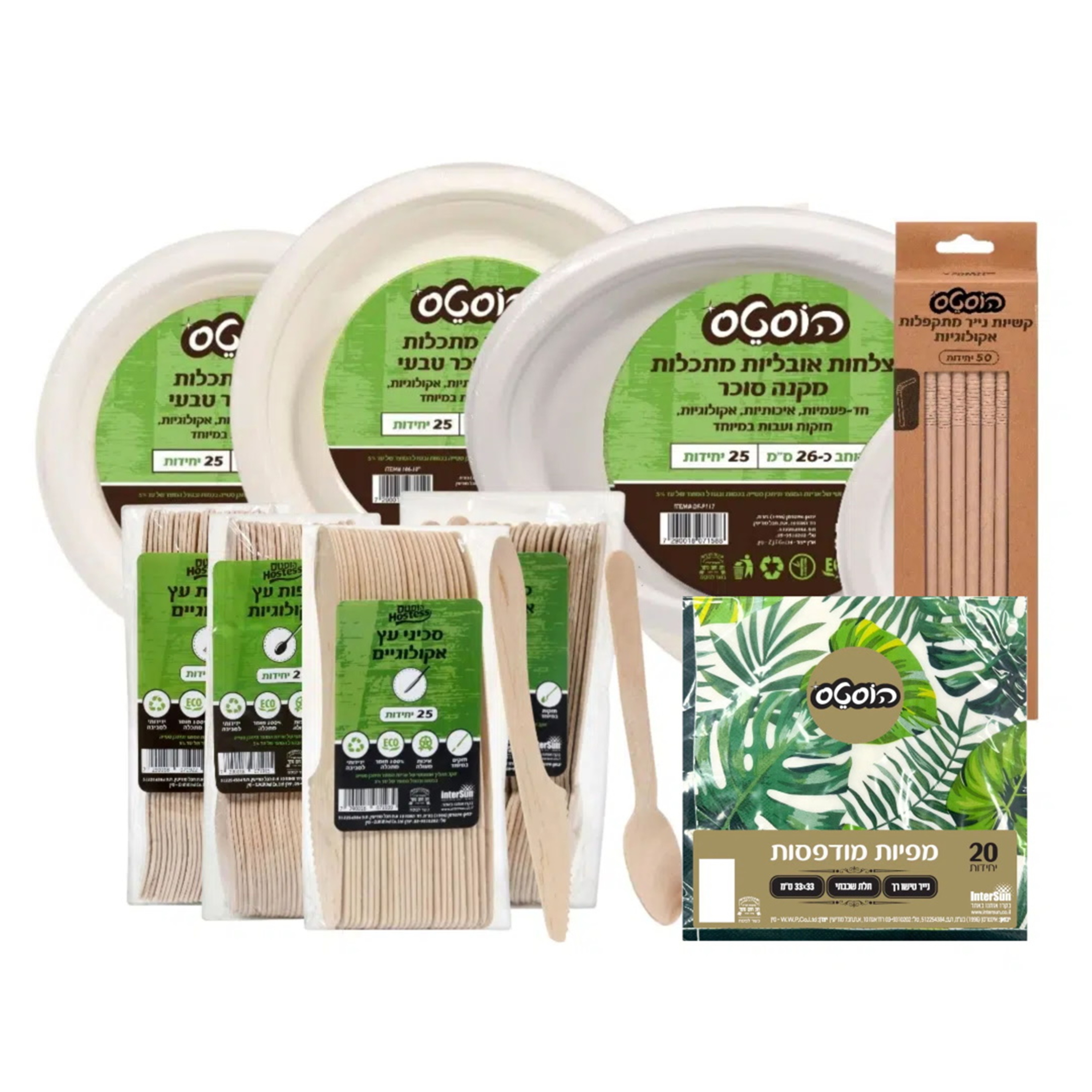 מותג הבית הוסטס מבית חברת אינטרסן, המתמחה בכלים חד-פעמיים, מציג חבילת אירוח שלמה ואקולוגית. החבילה, נבנתה במיוחד לאירוח חוץ ולחגיגות, כוללת את כל מה שצריך ליצירת שולחן: 25 צלחות עגולות, 25 צלחות אובליות גדולות (שתיהן בקוטר 26 ס"מ), 25 צלחות קטנות (בקוטר 17 ס"מ) ו-25 מרקיות (בקוטר 16 ס"מ) – כולן עשויות מקנה סוכר טבעי, חזק ועמיד במיוחד. בנוסף, החבילה כוללת סכו"ם מתכלה איכותי: 25 כפיות, 25 כפות, 25 סכינים ו-25 מזלגות. לצידם, קופסה עם 50 קשיות נייר אקולוגיות מתקפלות ו-20 מפיות נייר מעוצבות. החבילה מוצעת במחיר מיוחד של 89.90 שקלים.