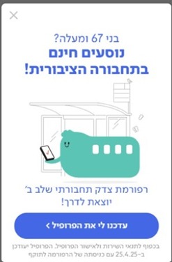 כיצד עושים את העדכון באופן עצמאי באפליקציית Moovit? יש להיכנס לתפריט, לבחור ב"החשבון שלי" ואז ב"הפרופיל שלי". מתחת לכך תופיע "+ פרופיל הנחה", שם יש לבחור ב"זהב קו-מעל 67". (אם האפשרות עדיין לא מופיעה, האפליקציה טרם עודכנה). לאחר מכן יש לצלם תעודה מזהה (דרכון או רישיון נהיגה) – והמידע יישלח לאישור תוך כמה ימים.כיצד עושים את העדכון באופן עצמאי באפליקציית פנגו? יש להיכנס לאפליקציית PANGO> חלונית תחבורה ציבורית "פרופיל הנחה"". על מנת להוסיף את הפרופיל יש לבחור בסימן+