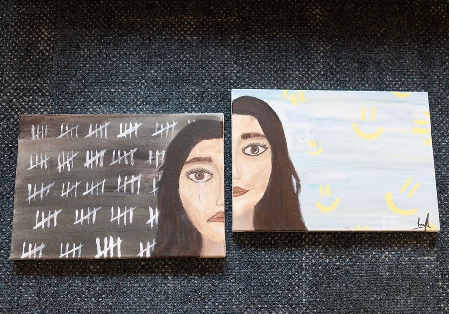 "לאורך כל השבי אסרו עלינו להביע רגשות, אסרו עלינו להתחבק, לבכות, לכעוס ואפילו לחייך. זה ריסק אותנו. הרגשנו לא אנושיות. חסרות רגשות. פחדנו שלא נוכל להביע יותר רגש. בוקר אחד לא יכולתי להכיל יותר את הקושי. והדמעות חנקו את הגרון ורק רצו לפרוץ החוצה. כל מה שהיה לי – זה מחברת ועט, אז ישבתי וציירתי את עצמי בוכה, ממש כמו שמצויר פה. כי לבכות – לא יכולתי. היום אני יושבת ומציירת לציור הזה את החצי השני, כשאני בבית. אבל חצי ממני עדיין נותר שם. בחדר ההוא. בזמן ההוא. בתחושות שאי אפשר להסביר. והציור הזה, הוא לא רק שלי. של כל מי שעדיין שם — מי שעדיין אסור לו לבכות, אסור לו לחייך, מי שעדיין סופר ימים על הקיר, ומי שעדיין לא זכה לכתוב את החצי השני של עצמו. אני ציירתי את עצמי, אבל אני יודעת שהעיניים בציור הזה — הן גם העיניים של מי שעוד מחכה. והלב בצד האפל — הוא עדיין פועם."